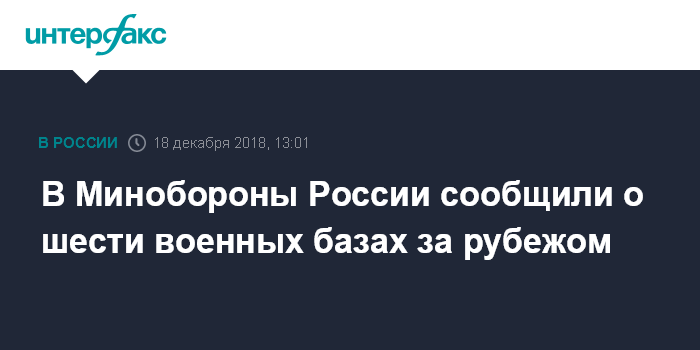 Москва. 18 декабря. INTERFAX.RU - Россия в настоящее время имеет шесть зарубежных военных баз, пять из них в странах "ближнего" зарубежья и одна - в Сирии, сообщается в брошюре "Армия России в сравнении", распространенной Минобороны перед началом расширенного заседания коллеги военного ведомства.
