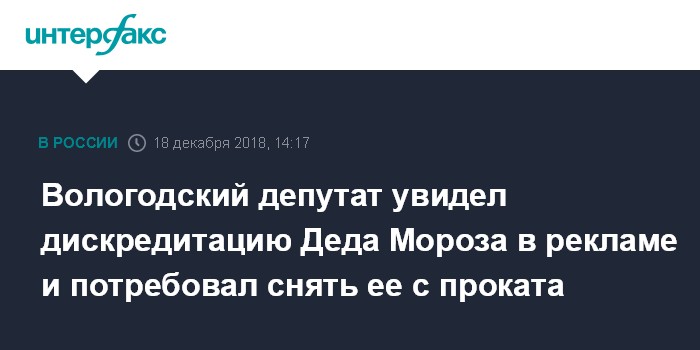 В обращении депутата также отмечается, что российский Дед Мороз давно стал одним из главных брендов Вологодской области, в продвижение которого регион вложил немалые средства. "Получается, что "Почта-Банк" пиарится на чужом бренде, пороча и очерняя его. Я и мои юристы видим в этом признаки нарушения закона о рекламе, о чем уведомим ФАС России", - говорится в письме.