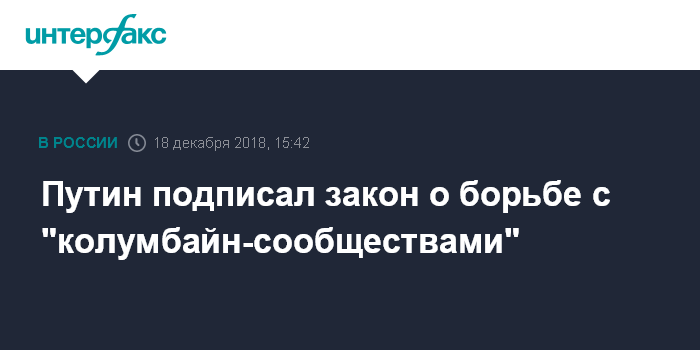 Москва. 18 декабря. INTERFAX.RU - Президент Владимир Путин подписал закон о мерах противодействия сайтам, подстрекающим детей к самоубийству или преступлениям, - так называемым "группам смерти" и "колумбайн-сообществам".