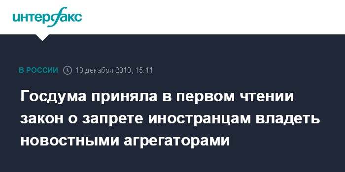 Москва. 18 декабря. INTERFAX.RU - Госдума во вторник приняла в первом чтении проект закона об ограничении права владения новостными агрегаторами для иностранцев, иностранных государств и международных организаций.