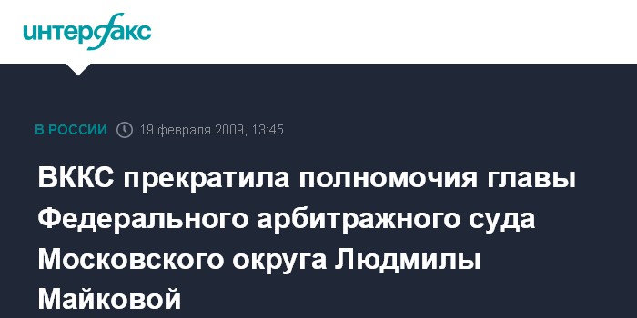 Москва. 19 февраля. INTERFAX.RU - Высшая квалификационная коллегия судей (ВККС) досрочно с 20 февраля прекратила полномочия главы Федерального арбитражного суда Московского округа (ФАС МО) Людмилы Майковой.