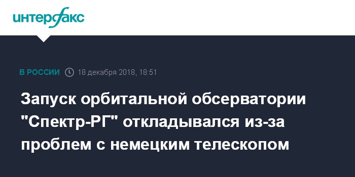 Москва. 18 декабря. INTERFAX.RU - Одна из проблем, вызвавших задержку в подготовке к запуску космической обсерватории "Спектр-РГ", связана с немецким телескопом eRosita. Об этом сообщил руководитель проектов "Спектр" НПО Лавочкина Илья Ломакин.