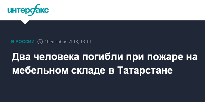 Москва. 19 декабря. INTERFAX.RU - Два человека погибли при пожаре на мебельном складе в Альметьевске (Татарстан), сообщил агентству "Интерфакс" в пресс-службе ГУ МЧС России по республике в среду.