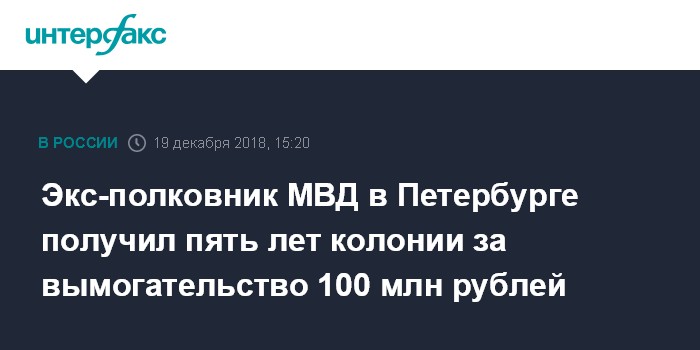 Экс-полковник МВД в Петербурге получил пять лет колонии за вымогательство 100 млн рублей