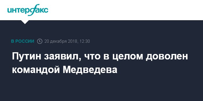 Москва. 20 декабря. INTERFAX.RU - Президент РФ Владимир Путин, в целом, доволен правительством под председательством премьер-министра Дмитрия Медведева.