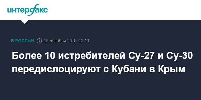 Москва. 20 декабря. INTERFAX.RU - Перелет с аэродрома "Крымск" в Краснодарском крае на аэродром "Бельбек" в Республике Крым совершат 22 декабря 2018 года более 10 истребителей Су-27СМ и Су-30М2 к месту постоянной дислокации, сообщает в четверг штаб Черноморского флота (ЧФ).