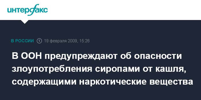 Москва. 19 февраля. INTERFAX.RU - Международный комитет по контролю над наркотиками ООН обеспокоен ситуацией с злоупотреблением сиропами от кашля в ряде стран мира.
