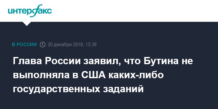 Москва. 20 декабря. INTERFAX.RU - Задержанная в США Мария Бутина никаких заданий госорганов Российской Федерации не выполняла, что бы она сама ни говорила под угрозой тюремного заключения, заявил в четверг президент РФ Владимир Путин.