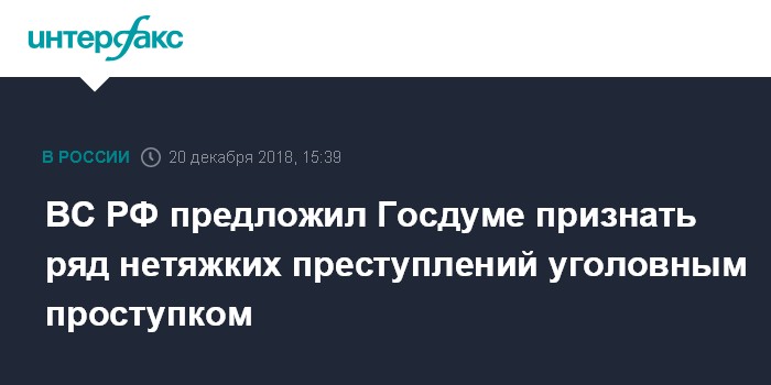 Москва. 20 декабря. INTERFAX.RU - Верховный суд РФ внес на рассмотрение Госдумы законопроект об отнесении к категории "уголовного проступка" ряда уголовных преступлений, за которые не предусмотрено лишения свободы, сообщает официальный сайт нижней палаты парламента.