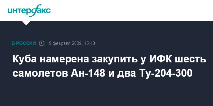 Москва. 19 февраля. INTERFAX.RU - Куба намерена закупить у ОАО "Ильюшин Финанс Ко" (ИФК) шесть самолетов Ан-148 и два лайнера Ту-204-300.