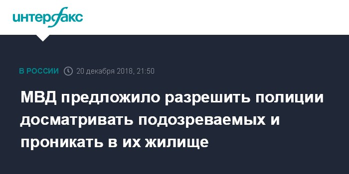 Москва. 20 декабря. INTERFAX.RU - Министерство внутренних дел РФ предлагает внести в закон "О полиции" ряд поправок, касающихся досмотра подозреваемых граждан и доступа в их жилище, говорится в сообщении, опубликованном в четверг на сайте ведомства.