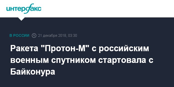 "В пятницу, 21 декабря, в 03:20 мск с космодрома Байконур (Республика Казахстан) успешно осуществлен пуск ракеты-носителя тяжелого класса "Протон-М" с космическим аппаратом в интересах Минобороны России", - сообщили в департаменте.