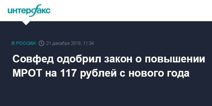 Москва. 21 декабря. INTERFAX.RU - Совет Федерации на заседании в пятницу одобрил закон о повышении минимального размера оплаты труда (МРОТ) на 117 рублей.