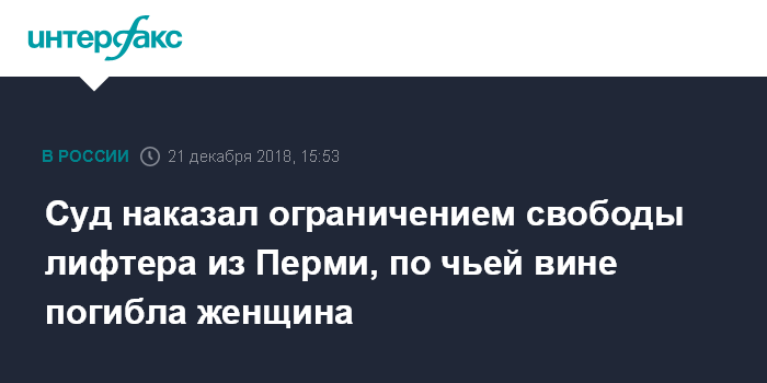 Москва. 21 декабря. INTERFAX.RU - Суд в Перми вынес обвинительный приговор бывшему лифтеру, из-за которой в шахте лифта разбилась 68-летняя женщина, сообщается в пресс-релизе регионального Следственного управления СКР в пятницу.
