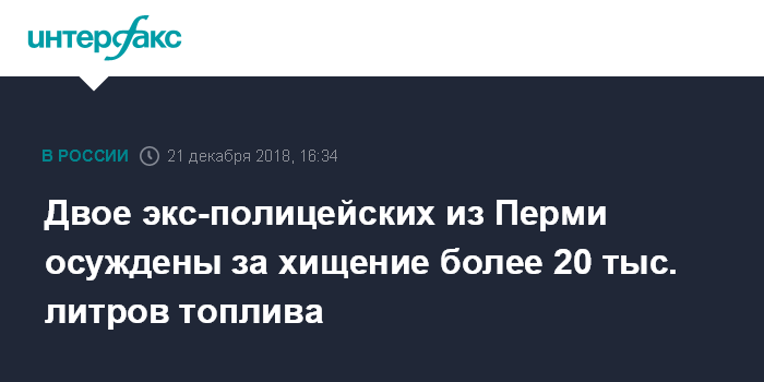 Москва. 21 декабря. INTERFAX.RU - Свердловский райсуд Перми вынес обвинительный приговор двум бывшим полицейским, которые похитили свыше 20 тысяч литров топлива, предназначенного для заправки служебных автомобилей. Об этом сообщается на сайте краевой прокуратуры в пятницу.