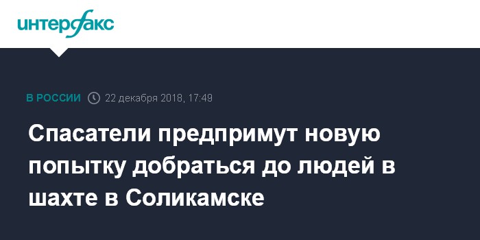 Москва. 22 декабря. INTERFAX.RU - Спасатели готовятся еще раз зайти на участок шахты "Уралкалия" в Соликамске, где заблокированы девять рабочих.