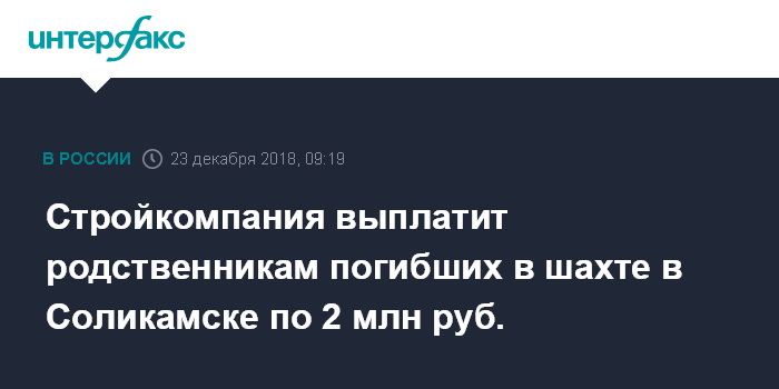 Стройкомпания выплатит родственникам погибших в шахте в Соликамске по 2 млн руб.