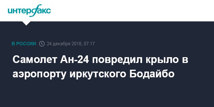 Москва. 24 декабря. INTERFAX.RU - Пассажирский самолет Ан-24 авиакомпании "РусЛайн" повредил крыло, задев мачту освещения при послепосадочном рулении в воскресенье, сообщает Восточно-Сибирское следственное управление на транспорте Следственного комитета РФ.