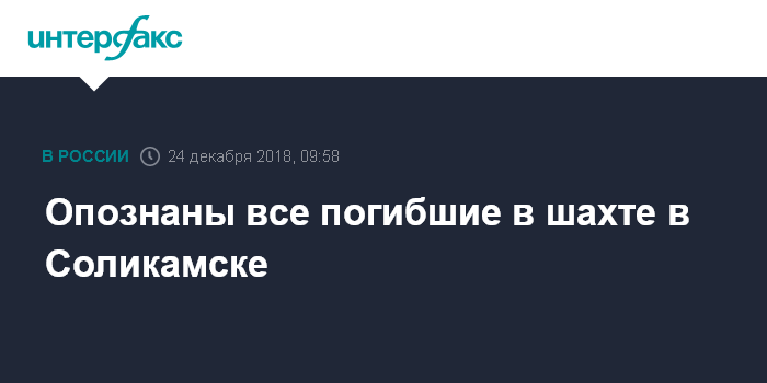 Москва. 24 декабря. INTERFAX.RU - Процедура опознания тел погибших в шахте "Уралкалия" строителей завершилась в Пермском крае, сообщил в понедельник "Интерфаксу" информированный источник.
