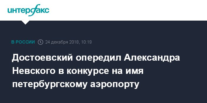 Москва. 24 декабря. INTERFAX.RU - Федор Достоевский обошел Александра Невского по итогам второго тура конкурса на присвоение имени аэропорту "Пулково".