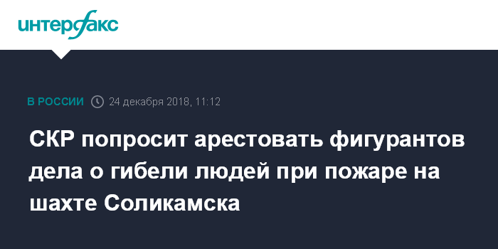 СКР попросит арестовать фигурантов дела о гибели людей при пожаре на шахте Соликамска