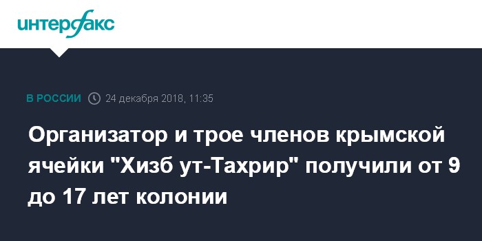 Москва. 24 декабря. INTERFAX.RU - Северо-Кавказский окружной военный суд вынес обвинительный приговор четырем жителям Узбекистана и Таджикистана за организацию и участие в ячейке террористической организации "Хизб ут-Тахрир" (запрещена в РФ) на территории Бахчисарая в Крыму, сообщает пресс-служба суда.