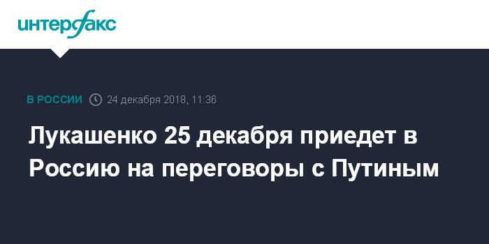 Москва. 24 декабря. INTERFAX.RU - Президент Белоруссии Александр Лукашенко 25 декабря совершит рабочий визит в Российскую Федерацию. Об этом сообщает в понедельник госагентство "БелТА" со ссылкой на пресс-службу белорусского лидера.