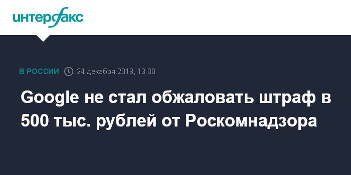 Москва. 24 декабря. INTERFAX.RU - Google не подавал в суд жалобу на штраф в 500 тыс. рублей, вынесенный Роскомнадзором за отказ компании подключится к единому реестру запрещенных в РФ сайтов для фильтрации поисковой выдачи, сообщили "Интерфаксу" в пресс-службе компании.