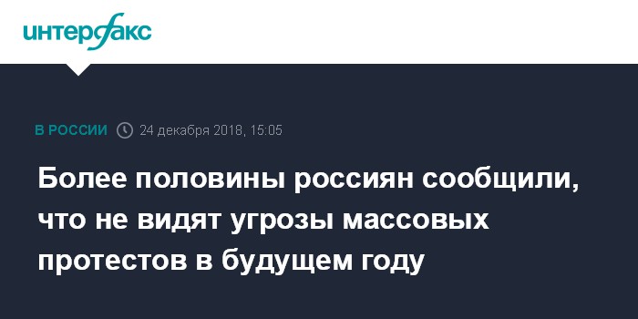 Москва. 24 декабря. INTERFAX.RU - Более половины (53%) россиян считают, что в 2019 году не следует ждать массовых протестов, свидетельствуют данные опроса "Левада-центра", поступившие в "Интерфакс".