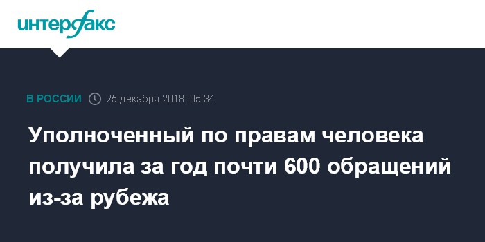 "Российские граждане, попавшие за границей в непростые ситуации, в 2018 году активно обращались за поддержкой к правозащитнику Татьяне Москальковой. В пресс-службе омбудсмена рассказали (...) что в общей сложности "было зафиксировано 597 обращений"", - говорится в публикации.