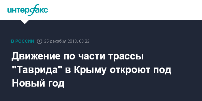 Москва. 25 декабря. INTERFAX.RU - Рабочее движение по первой очереди федеральной трассы "Таврида" в Крыму - по двум полосам от Керчи на востоке полуострова до Симферополя в центральной части - планируется открыть в ночь на 31 декабря, сообщила пресс-служба министерства транспорта Крыма во вторник.