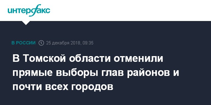 Москва. 25 декабря. INTERFAX.RU - Депутаты Законодательной думы Томской области на очередном собрании во вторник окончательно одобрили поправки в областной закон, которые предполагают отмену прямых выборов глав районов и городов за исключением регионального центра, передает корреспондент агентства "Интерфакс" из зала парламента.