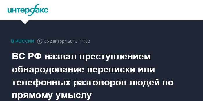 Москва. 25 декабря. INTERFAX.RU - Верховный суд РФ разъяснил, что обнародование переписки или телефонных разговоров граждан является преступлением, если это сделано с прямым умыслом.