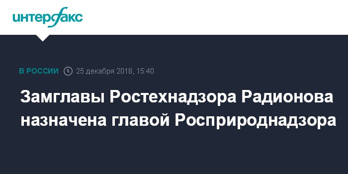 Москва. 25 декабря. INTERFAX.RU - Заместитель руководителя Ростехнадзора Светлана Радионова назначена главой Росприроднадзора. Соответствующее распоряжение подписал премьер-министр РФ Дмитрий Медведев.