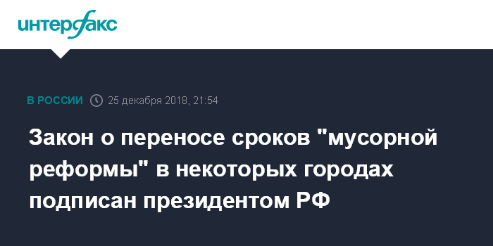 Москва. 25 декабря. INTERFAX.RU - Президент РФ Владимир Путин подписал закон, который наделяет Москву, Санкт-Петербург и Севастополь правом до 1 января 2022 года не применять положения федерального законодательства о сборе, накоплении, транспортировании, обработке, утилизации, обезвреживании, хранении, захоронении твердых коммунальных отходов (ТКО) региональными операторами ("мусорная реформа").