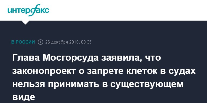 Москва. 26 декабря. INTERFAX.RU - Законопроект о запрете "клеток" для подсудимых нуждается в тщательной доработке, заявила председатель Мосгорсуда Ольга Егорова в интервью "Интерфаксу".