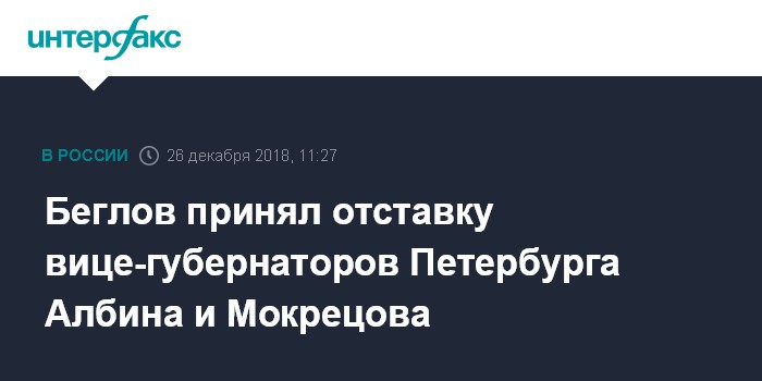 Москва. 26 декабря. INTERFAX.RU - Временно исполняющий обязанности губернатора Санкт-Петербурга Александр Беглов принял отставку вице-губернаторов Игоря Албина и Михаила Мокрецова, сообщила пресс-служба Смольного.