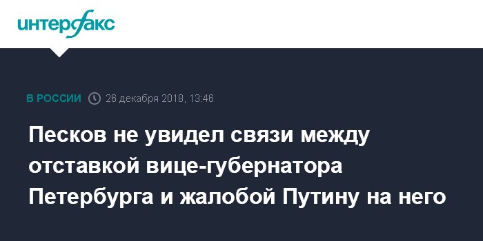 Песков не увидел связи между отставкой вице-губернатора Петербурга и жалобой Путину на него
