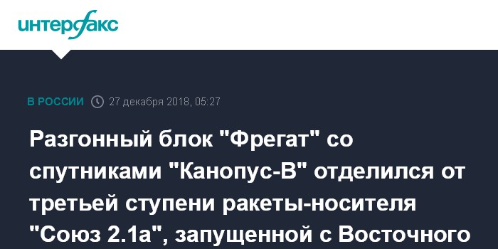 Москва. 27 декабря. INTERFAX.RU - Разгонный блок "Фрегат" со спутниками дистанционного зондирования Земли "Канопус-В" и попутной нагрузкой отделился от третьей ступени ракеты-носителя "Союз 2.1а" после запуска с космодрома Восточный, сообщили "Интерфаксу" в "Роскосмосе".