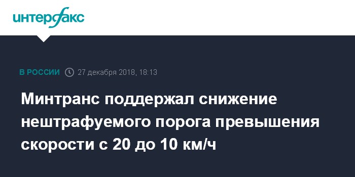 В середине декабря правительственная комиссия по безопасности дорожного движения поручила МВД (ГИБДД) и Минтрансу до 1 марта 2019 года представить предложения по изменению Кодекса об административных правонарушениях в части введения штрафа за превышение скорости на 10-20 км/ч.