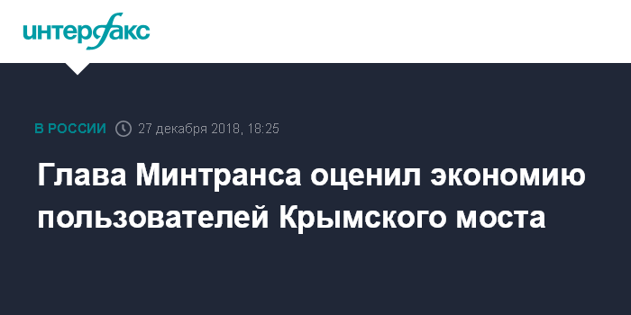 Москва. 27 декабря. INTERFAX.RU - Минтранс РФ оценил общую экономию пользователей Крымского моста в 11 млрд рублей в год.