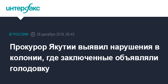 Москва. 28 декабря. INTERFAX.RU - Прокурор Якутии Николай Пилипчук провел проверку соблюдения уголовно-исполнительного законодательства и выявил нарушения в исправительной колонии №1 Якутска, где заключенные объявляли голодовку, сообщает пресс-служба региональной прокуратуры.