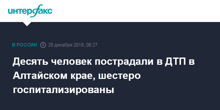 "28 декабря в 0:30 местного времени (27 декабря в 20:30 по Москве) в Зональном районе произошла авария. Всего в машинах находилось 11 человек. В результате аварии пострадали 10 человек. Погибших нет. На месте аварии работали 5 бригад "скорой помощи". Все пострадавшие доставлены в Центральную городскую больницу и городскую больницу № 2 Бийска. 6 человек, из них 5 детей, госпитализированы с травмами средней тяжести", - сказали в пресс-центре.