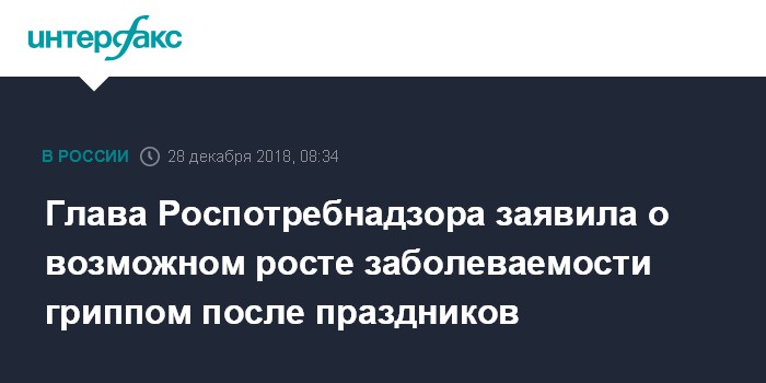Москва. 28 декабря. INTERFAX.RU - Подъема заболеваемости гриппом и ОРВИ можно ждать после новогодних праздников, заявила глава Роспотребнадзора Анна Попова.