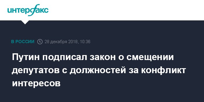 Москва. 28 декабря. INTERFAX.RU - Президент РФ Владимир Путин подписал закон о лишении постов депутатов и сенаторов за конфликт интересов.