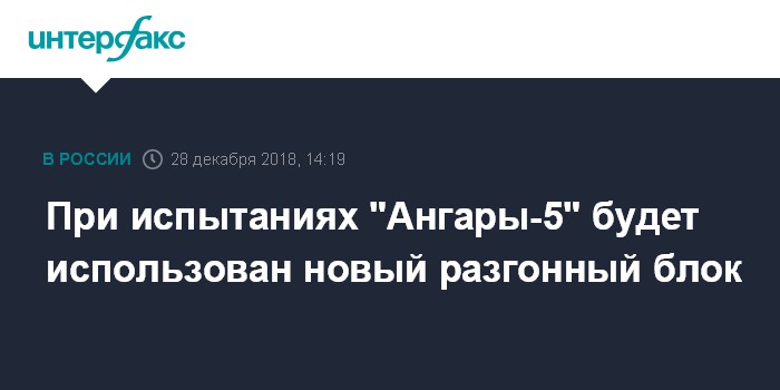 Москва. 28 декабря. INTERFAX.RU - На испытаниях тяжелой ракеты-носителя "Ангара-5" , запланированных на 2019 год, будет использоваться новый разгонный блок. Об этом сообщил первый замгендиректора "Красмаша" Леонид Кайчук.