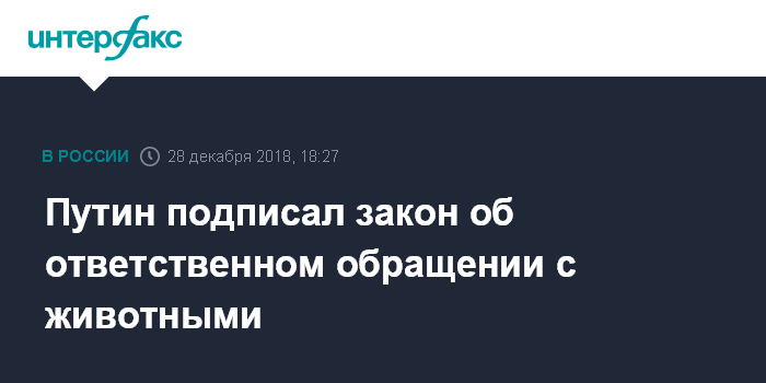 Москва. 28 декабря. INTERFAX.RU - Президент России Владимир Путин подписал закон "Об ответственном обращении с животными и о внесении изменений в отдельные законодательные акты Российской Федерации".