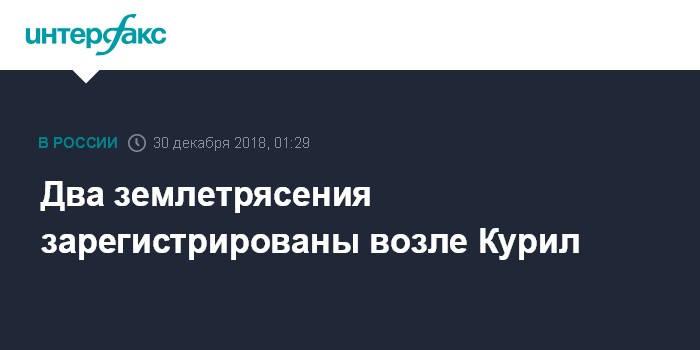 Москва. 30 декабря. INTERFAX.RU - Два землетрясения зарегистрированы в воскресенье возле Курильских островов, сообщила "Интерфаксу" руководитель Сахалинского филиала Единой Геофизической службы РАН Елена Семенова.