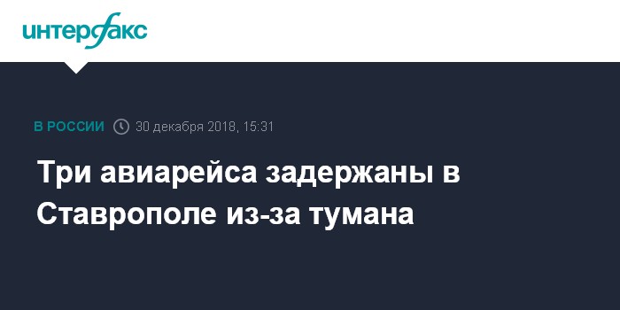 Москва. 30 декабря. INTERFAX.RU - Туман стал причиной задержки двух рейсов "Москва-Ставрополь", а также рейса "Ставрополь-Ереван", сообщается на сайте аэропорта.