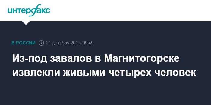 Москва. 31 декабря. INTERFAX.RU - Минздрав РФ сообщает, что из-под завалов дома в Магнитогорске извлечены четыре человека, в том числе один ребенок.